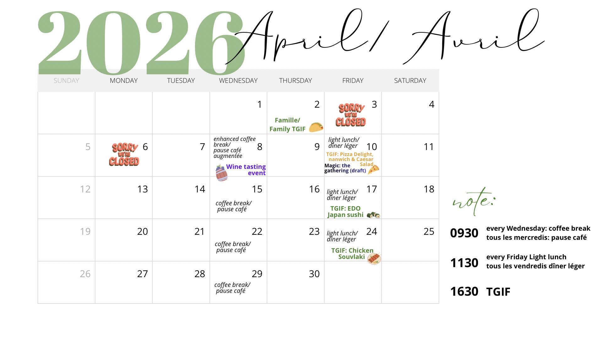 View our monthly calendars for coffee break, light lunch, TGIF and other events.