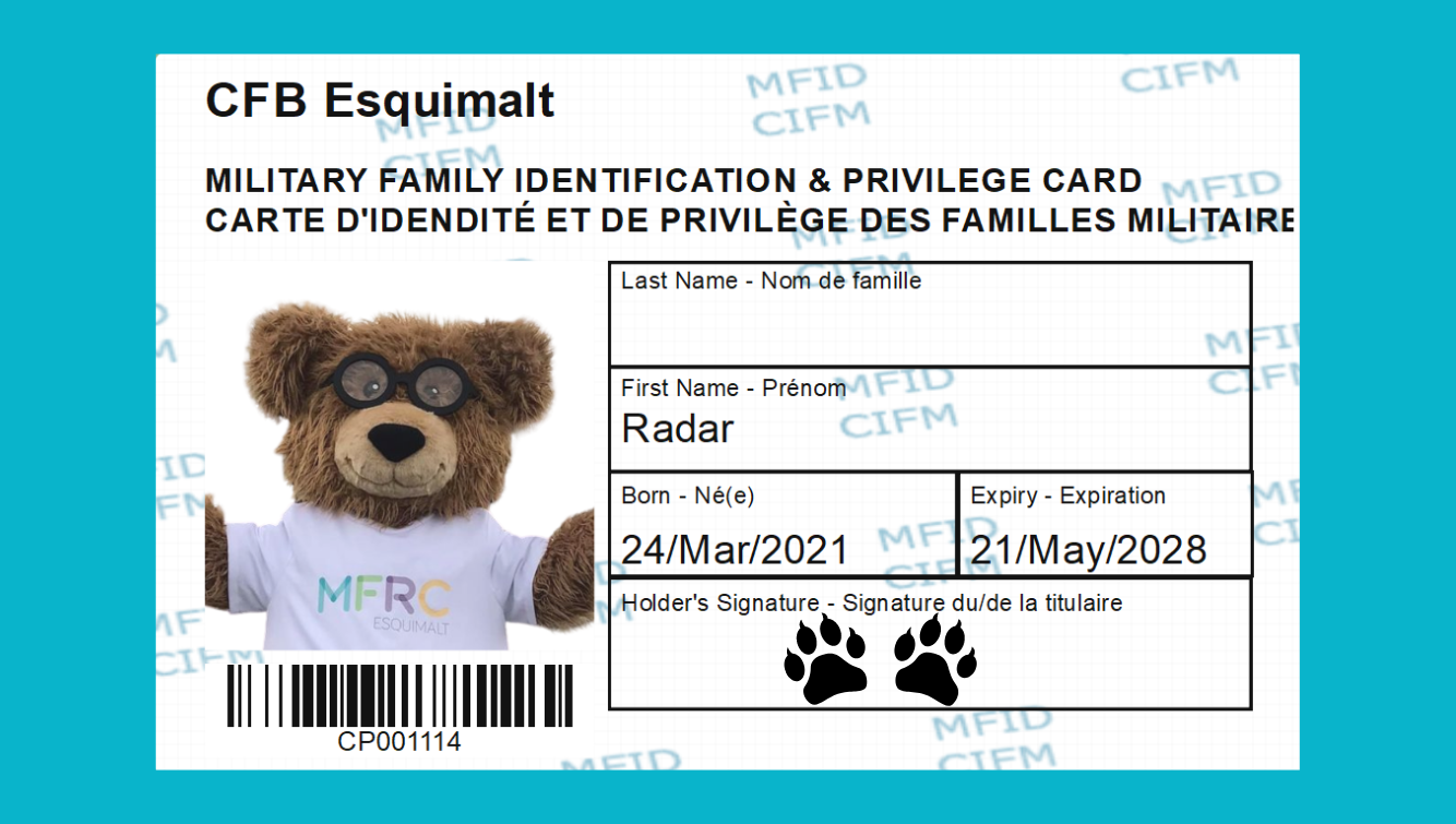 Military member and card applicant must be present in order to issue an MFID card. Cards can be issued at our MFRC offices during regular office hours. After showing a valid military ID, the military member will need to present their MPRR (Member Personnel Record Resume) naming eligible family members. A photo of the card holder is required as well as signature of both the card holder and the Military member. The process takes approximately 15 minutes.