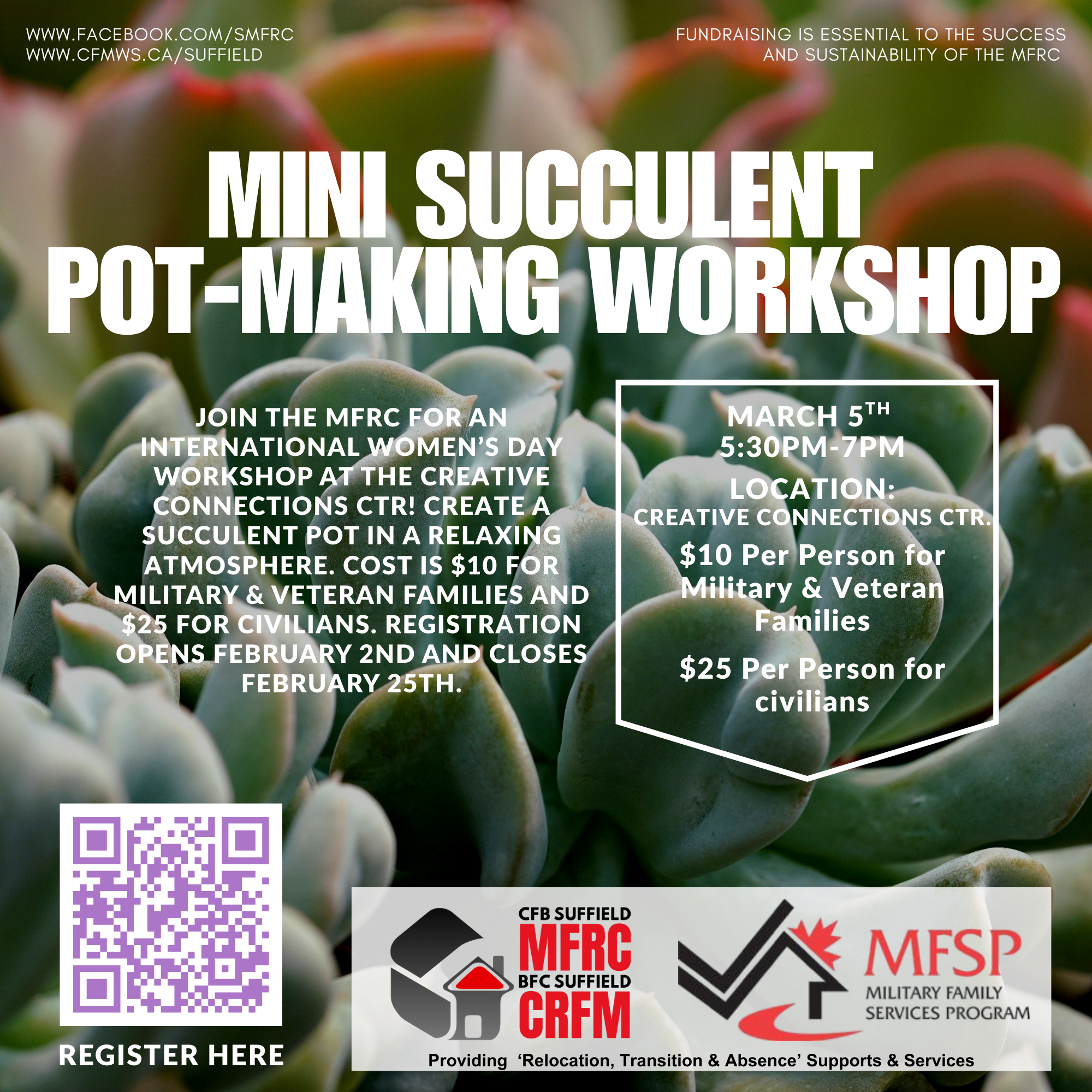 Take time to unwind while creating a beautiful succulent pot in a calm and welcoming space. Cost is $10 for Military & Veteran families and $25 for civilians. Registration opens February 2 and closes February 25.